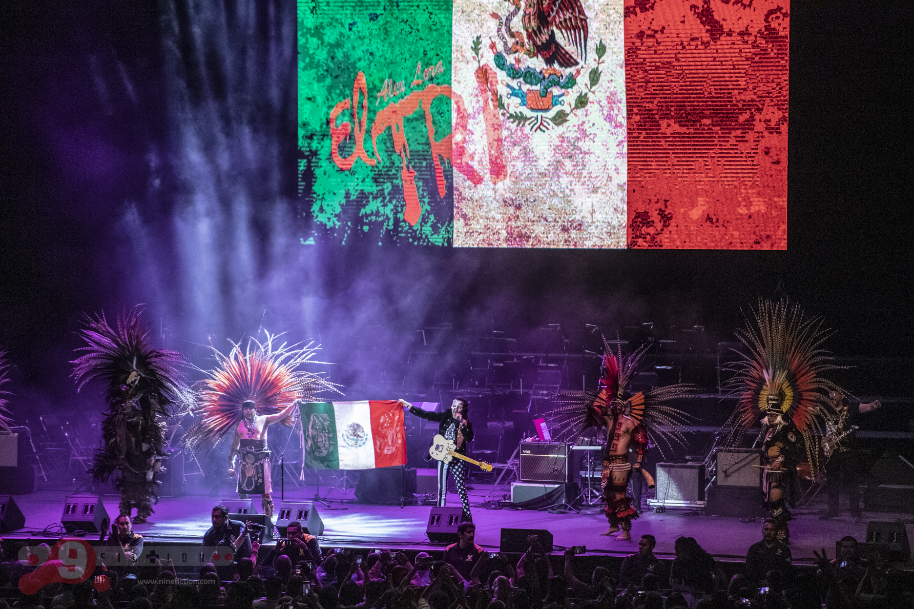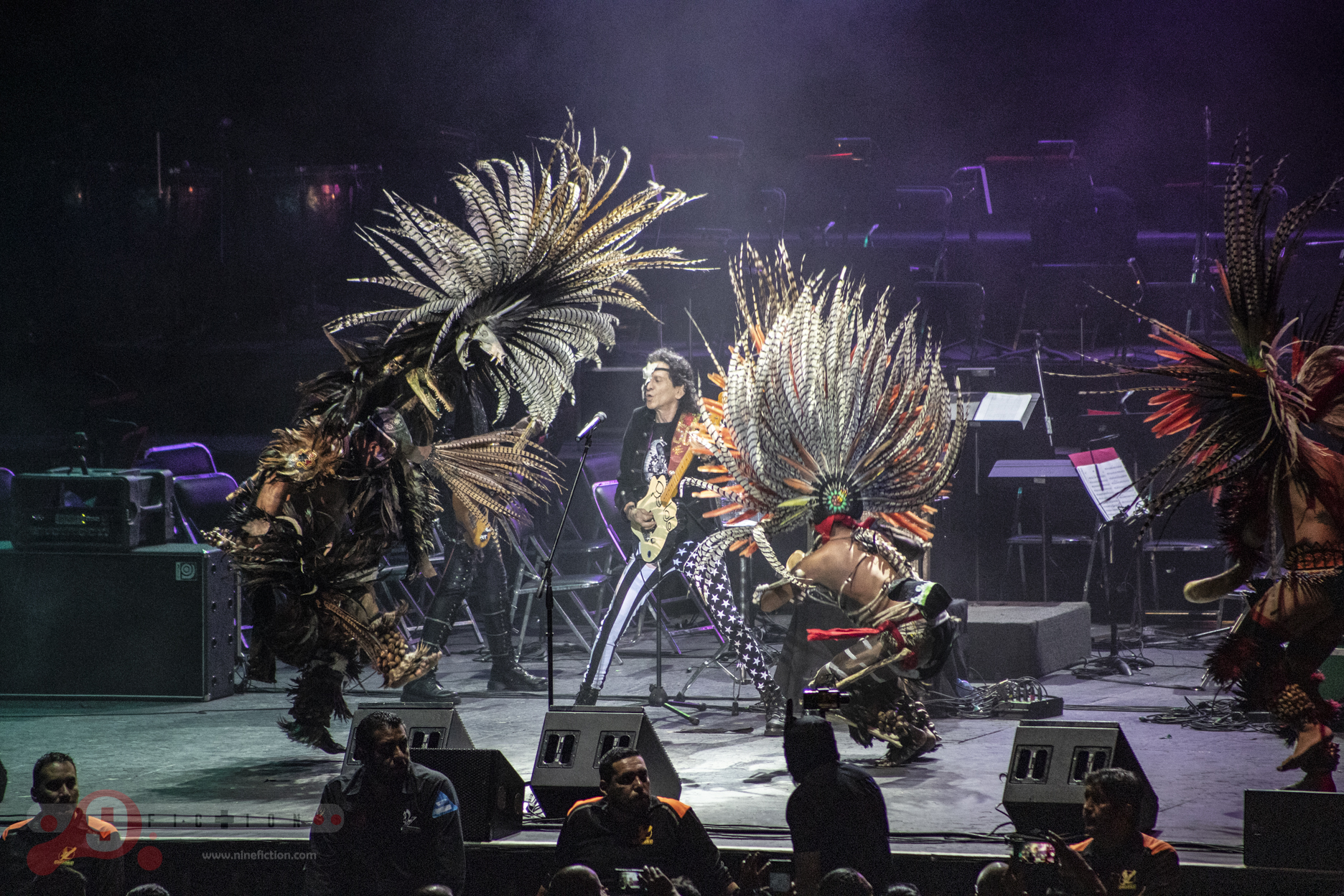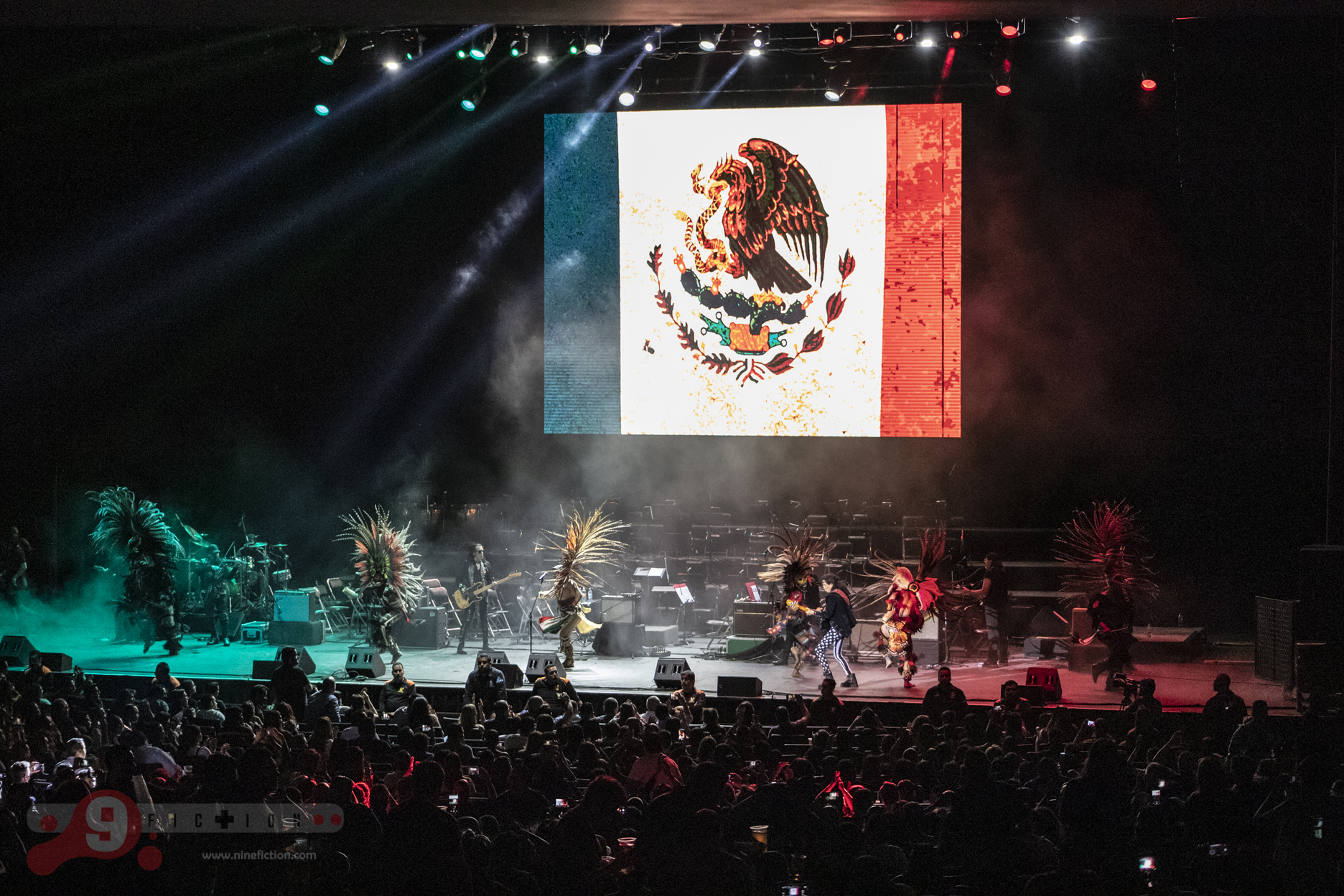 Siguiente escena, entran cinco danzantes ataviados y engalanados con vestimenta ceremonial Azteca, moviéndose en consonancia de las rítmicas de Lora y compañía, una mezcolanza extraña que solo el mexicano entiende por qué existe; es decir, estábamos percibiendo un ritual sanador y de buena vibra para lo que a continuación sucedería.