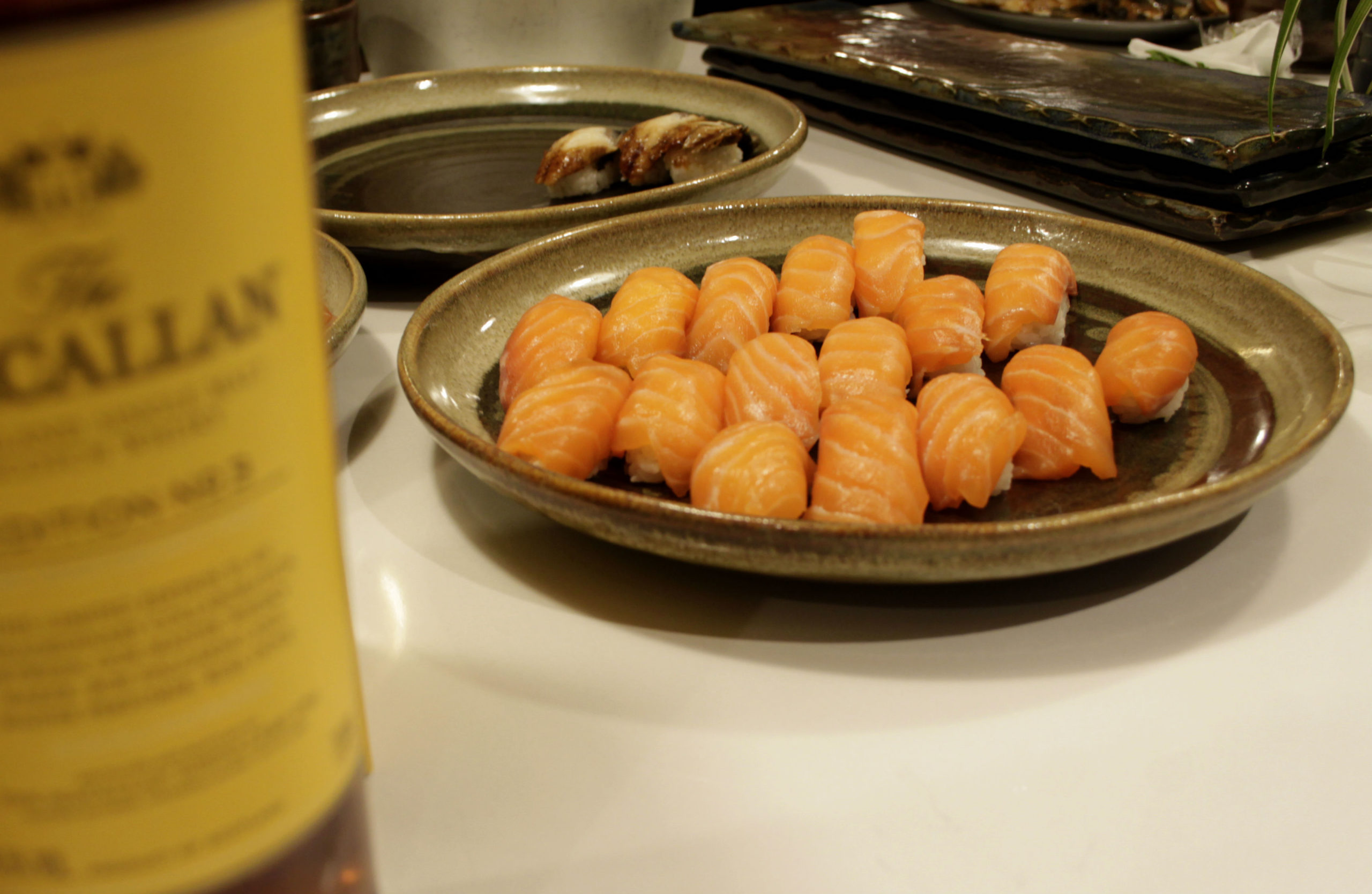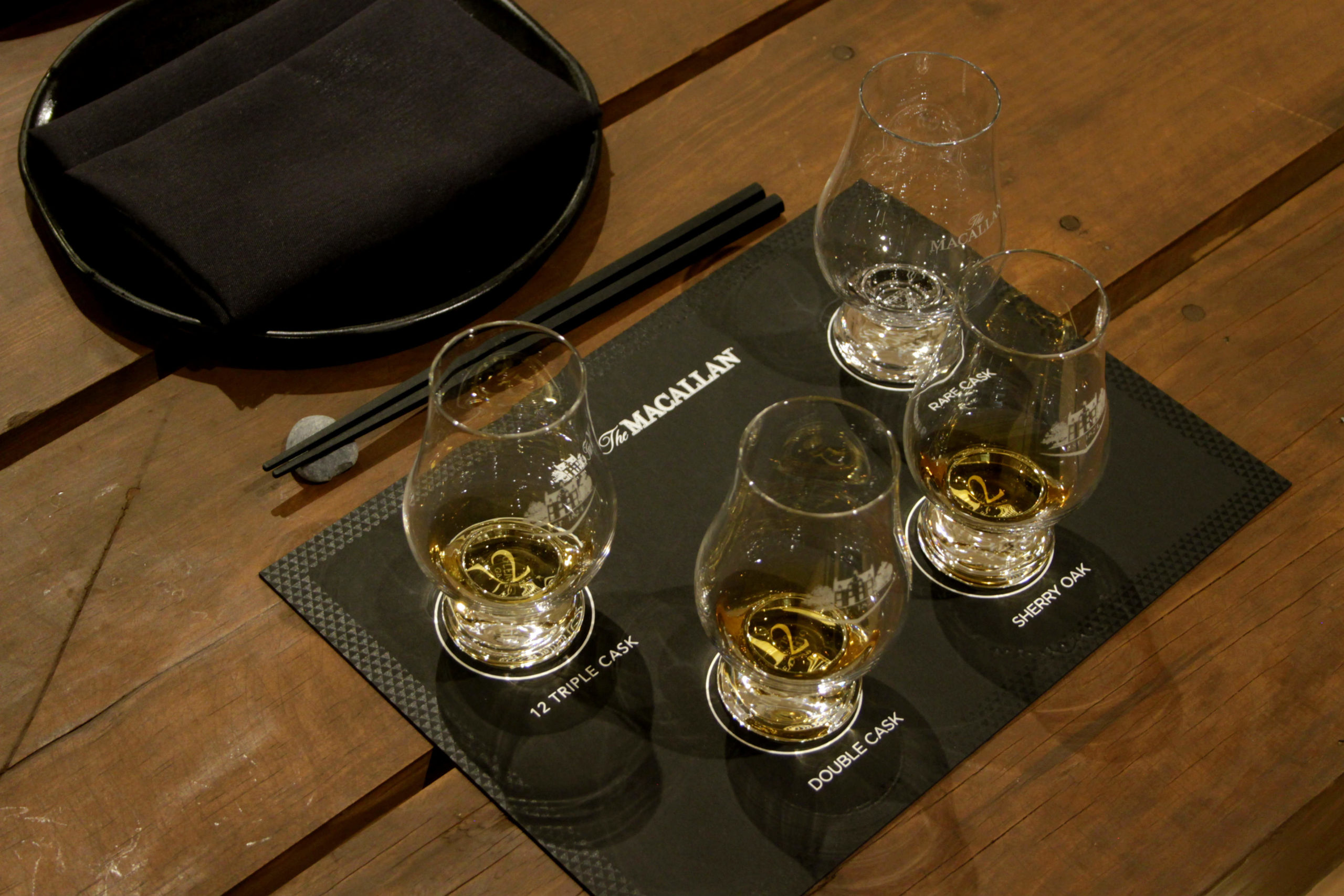 Antes de tomar asiento, los invitados pudieron degustar cócteles preparados a base de Macallan, con hierbabuena y cítricos, experiencia por demás refrescante para la garganta. Enseguida, se procedió a la cata que tuvo como protagonistas al The Macallan Triple Cask 12 Años (que se acompañó por un nigiri de salmón), The Macallan Double Cask 12 Años (que se unió a un nigiri de anguila flameada), The Macallan Sherry Oak 12 Años (que se maridó con pork belly) y se concluyó con una degustación exclusiva del The Macallan Rare Cask, el cual es envejecido en una selección de 16 barricas de roble distintas, con una poderosa calidad atemporal y destellos iniciales de uvas pasas y vainilla, que enseguida dan paso a un lado frutal donde florece la naranja, el limón y la manzana, con vaivenes de clavo, jengibre y canela.